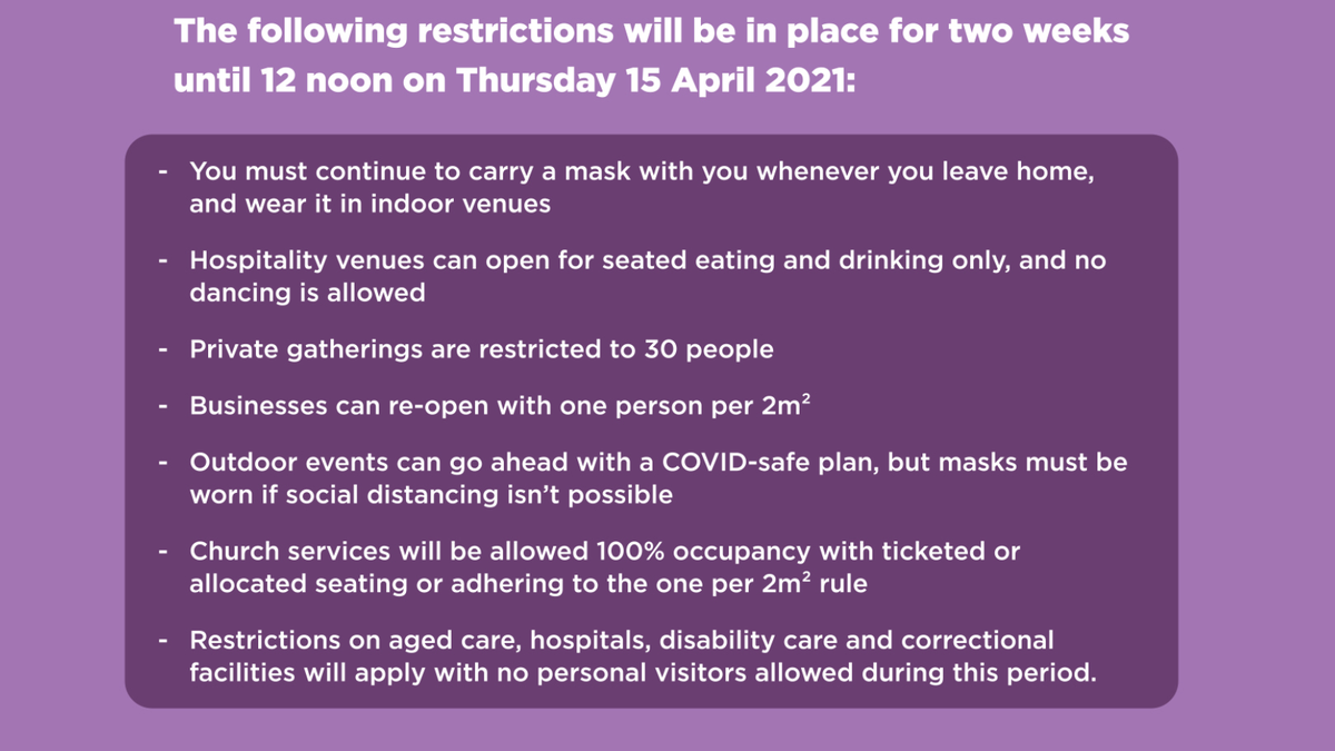 From 1am yesterday, anyone who has been in victoria since may the restrictions mirror those announced by the victorian government yesterday.